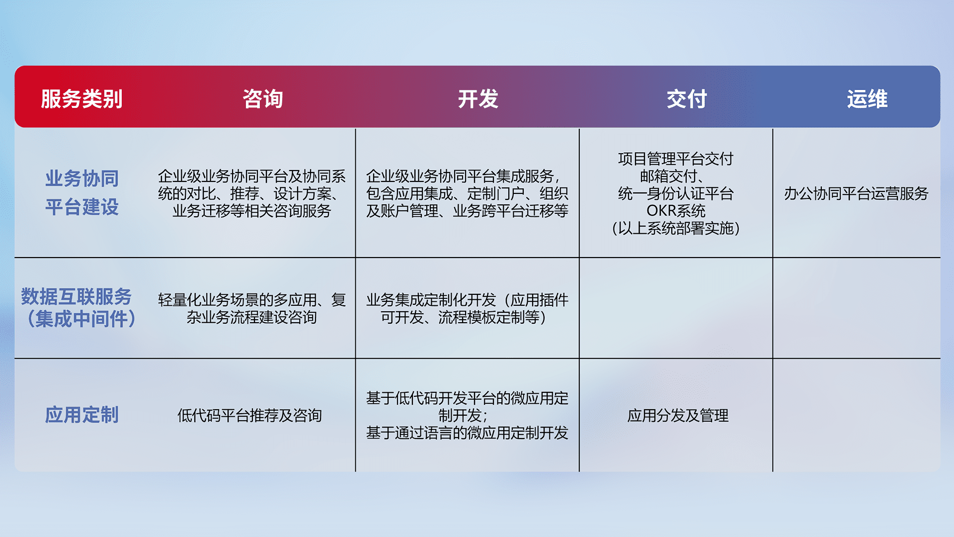 针对钉钉、、、、企微、、、IDaas等平台级产品提供产品的规划、、、方案、、交付、、、、定制化开发等服务,,,,实现如统一协同办公、、、、智能客户服务、、混合会议管理、、智能数据查询、、、等业务场景,,实现数字化转型。。。