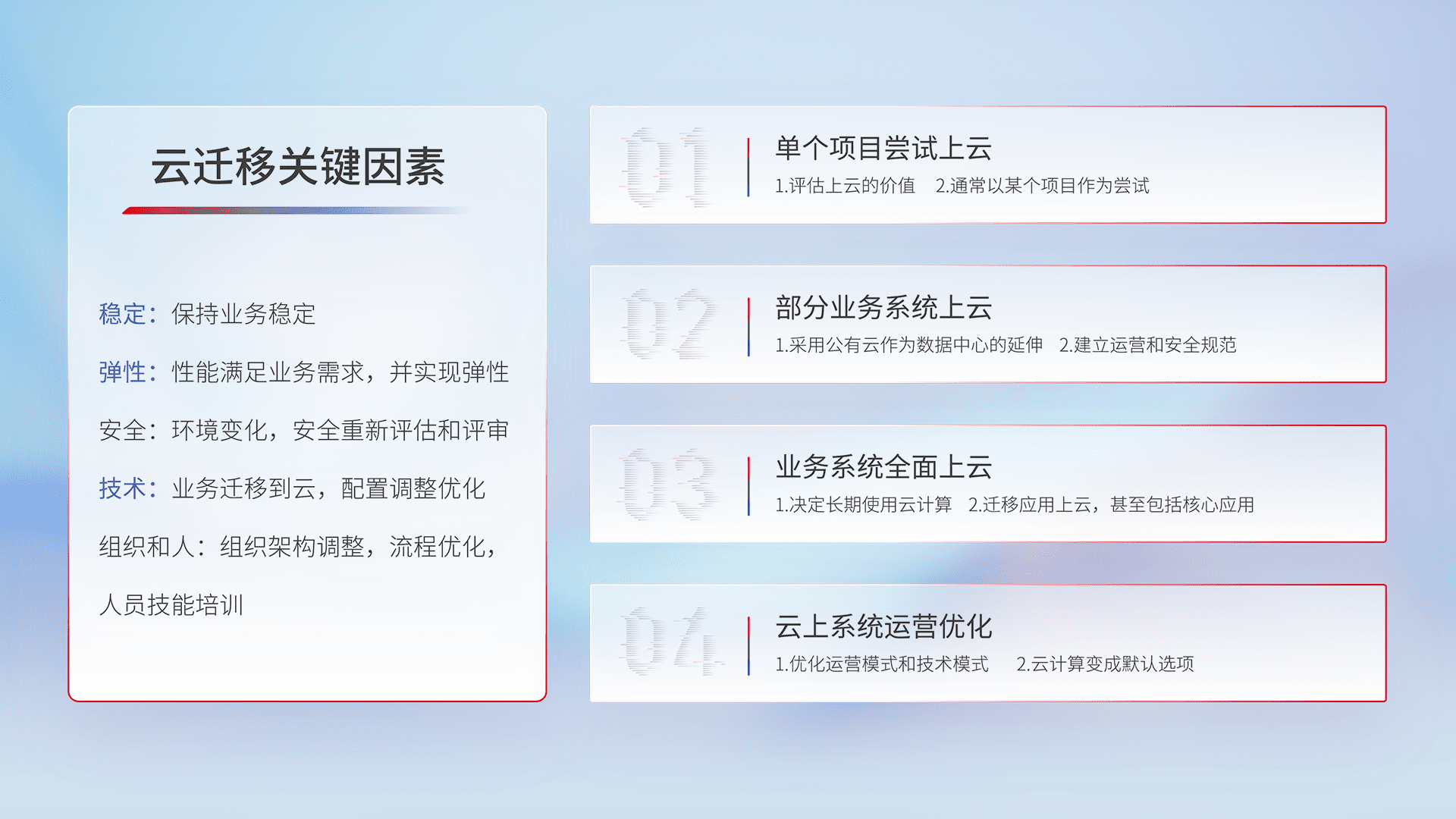结合实际业务,,从规划设计、、、、云平台选型、、云原生改造、、、、数据迁移、、、集成交付,,迁移全过程为客户识别最佳上云路径,,,,做好风险识别管理,,,设计网络架构、、、、身份权限、、、、安全审计合规、、、操作审计、、日志审计、、、监控告警策略、、、多站点容灾设计等,,对云上基础设施进行整体规划,,提升IT治理水平,,以满足弹性、、、、高可用、、高性能的需求。。