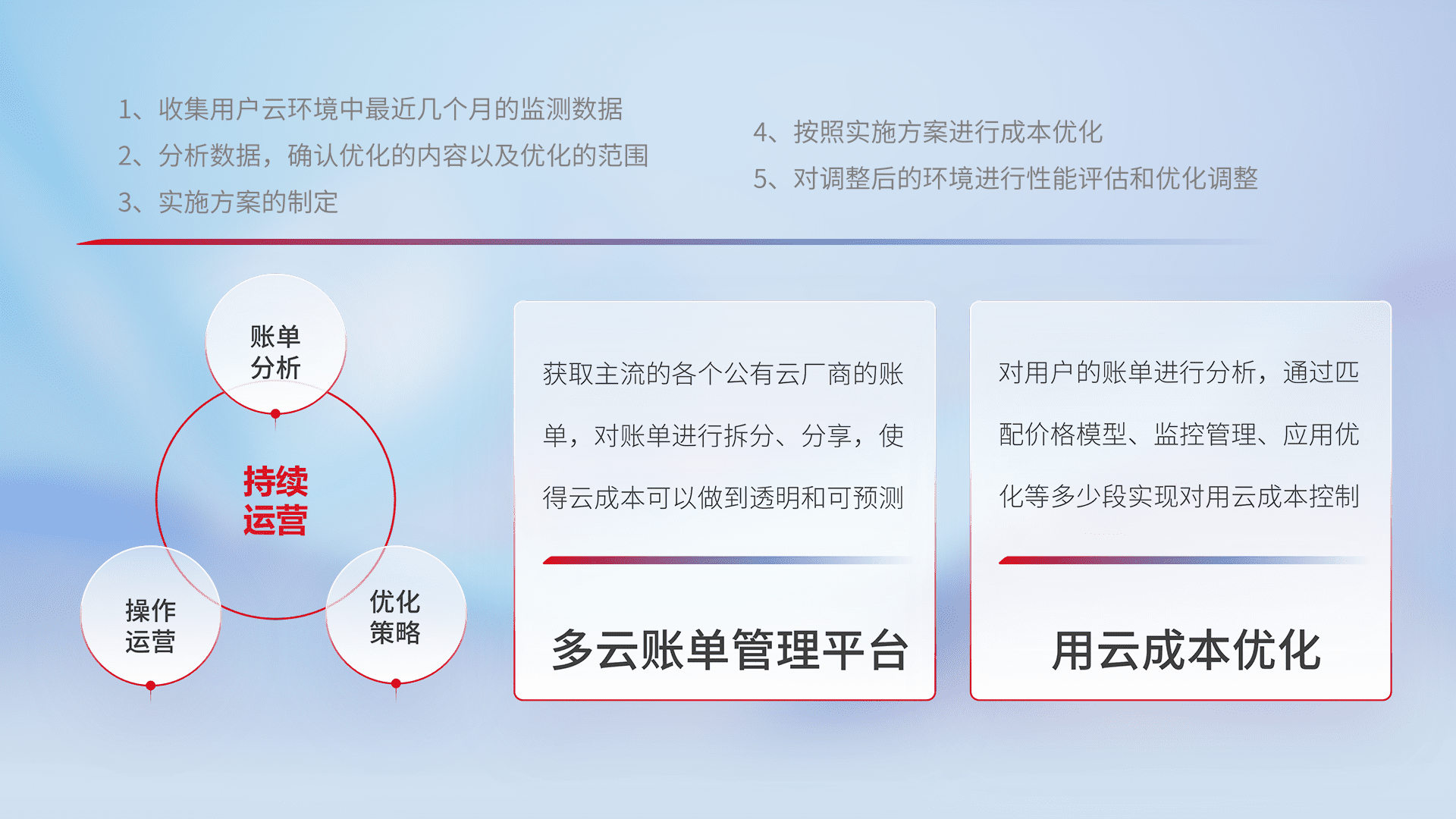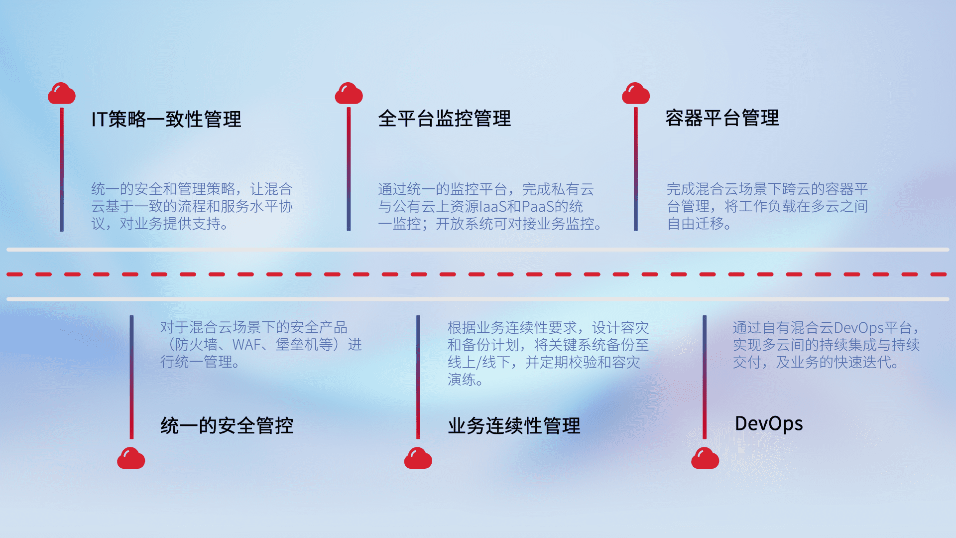 通过多云纳管,,,,以统一的资源数据模型把客户的云资源进行抽象和封装,,,,进而实现对多云资源的统一操作,,保障云资源管理的可靠性、、稳定性与可用性。。。。量身定制化运维内容,,,配置、、、开发运维、、补丁管理、、备份、、、监控、、认证和访问管理、、审计和日常巡检等,,,保障在用云过程中的可靠度,,稳定度以及高可用率。。。